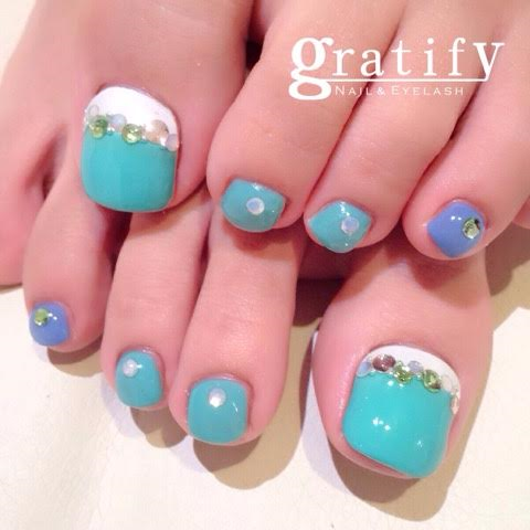 爽やかなエメラルドグリーンをベースにしたフットネイルです。